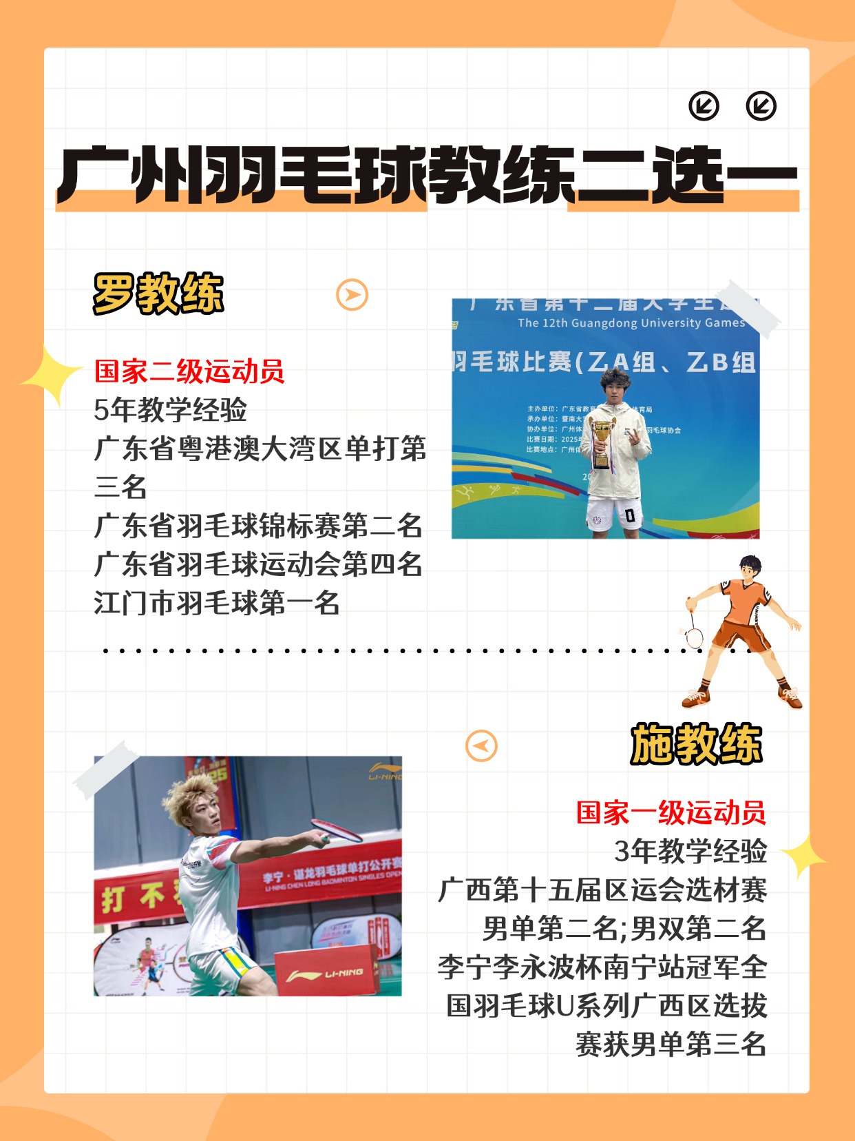 广州这两位宝藏教练,一个是省赛奖牌拿到手软的 “教学细节控”,一个是刚在李宁・谌龙单打公开赛拿下亚军的 “竞技实力派”,看完这篇对比,选教练不纠结!
