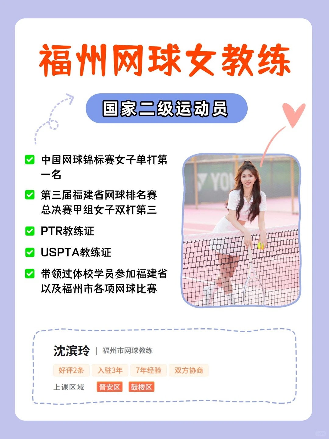 为大家介绍一位福州的网球教练——沈滨玲。她不仅拥有运动员的专业背景,更在2023、2024年连续获得全国大学生网球锦标赛女子单打优异成绩,教学耐心细致,尤其适合儿童启蒙与成人系统训练。