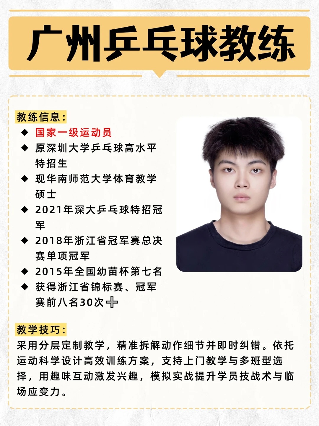 他是名副其实的国家一级乒乓球运动员 🏅,从小接受专业训练,13岁就进入 浙江省队 训练,之后以 深圳大学乒乓球高水平特招生 身份入学,更在2021年拿下校内特招冠军。目前他还在 华南师范大学攻读体育教学硕士,理论+实战双重加持,教学很有体系!