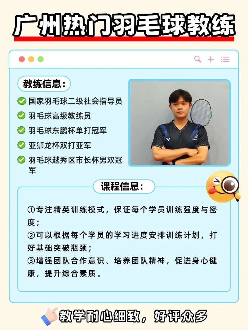 🎯 专业背景也很扎实: 国家羽毛球二级社会指导员 + 羽毛球高级教练员,教学规范,基础打得牢。