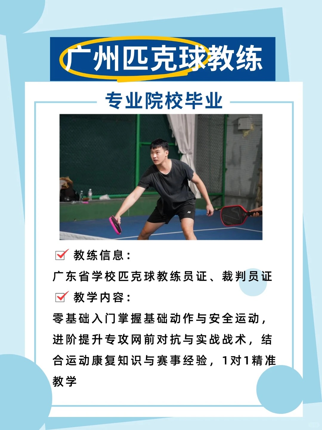 ✔️ 战绩说话:虽是2024年新晋教练,但已拿下“挑战杯”匹克球混双亚军🏆,懂理论更懂实战,尤其擅长带零基础成人和8岁以上青少年入门。