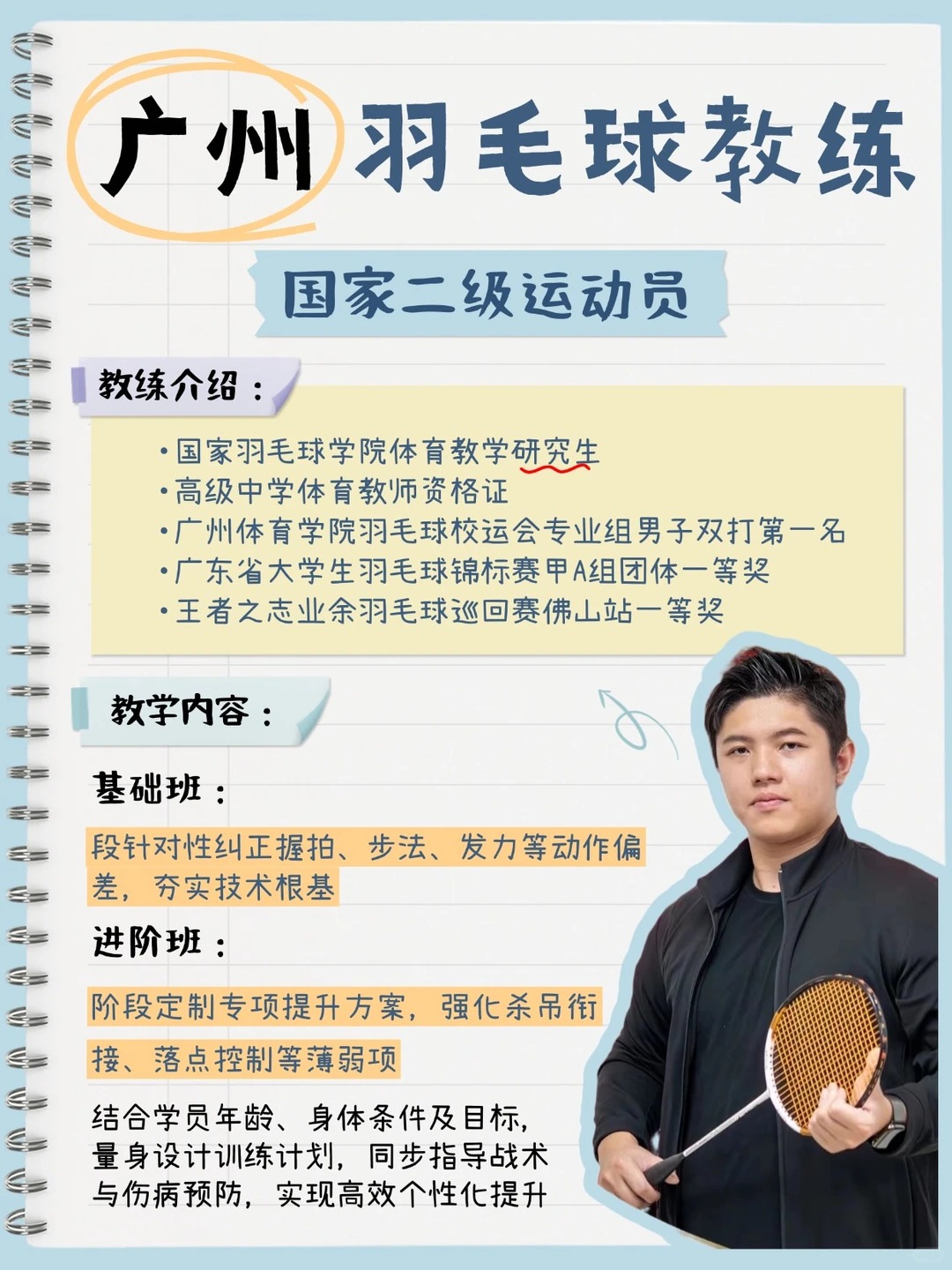 🏆 实战派成绩,经验丰富 广体校运会男双冠军、省大学生锦标赛一等奖…他的履历很能打。更重要的是,他有超过7年的教学经验,无论是零基础小白、动作“野路子”,还是寻求突破的业余高手,他都有大量成功案例。