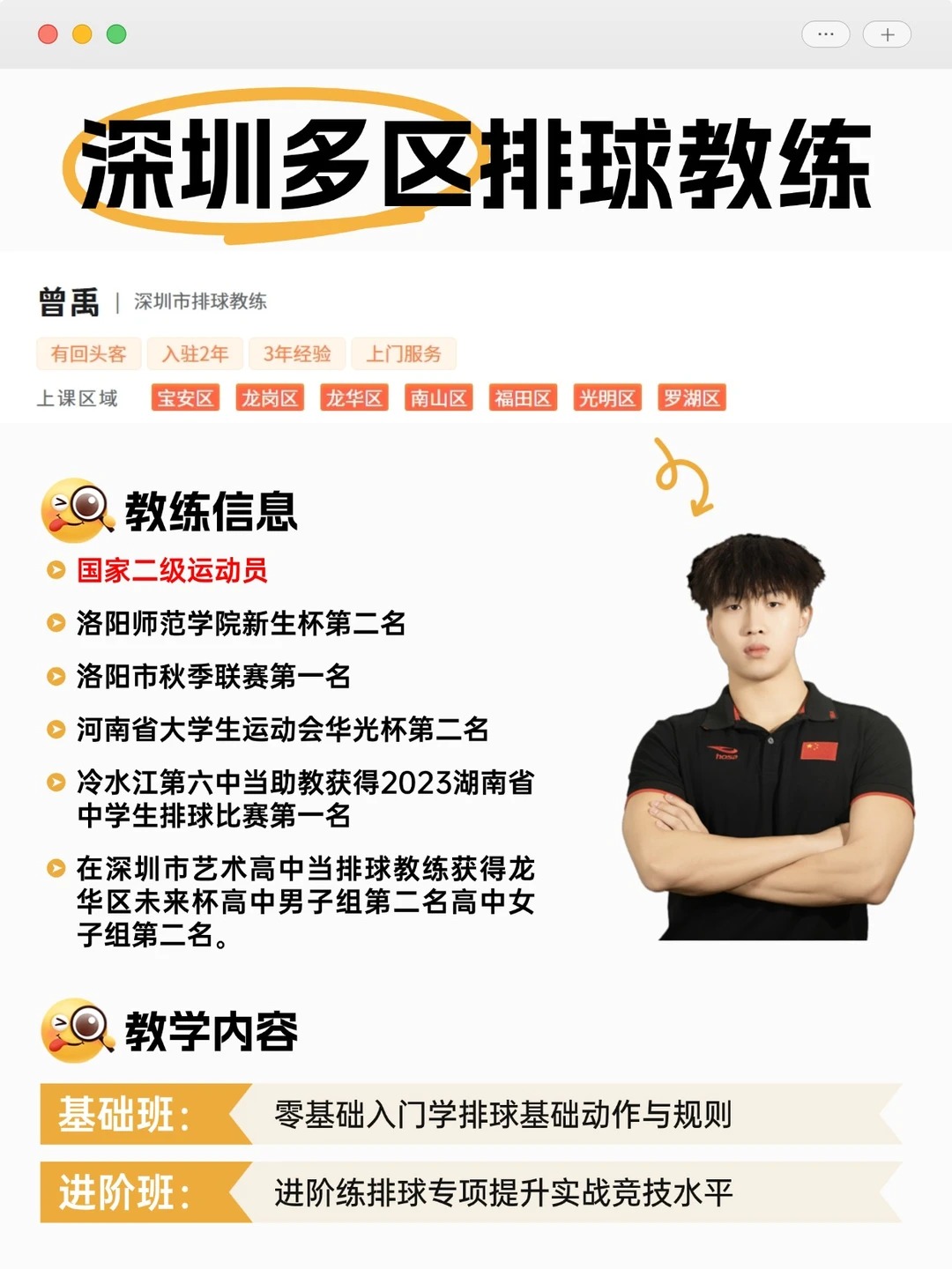 想在深圳找一个国家二级运动员出身、带过省冠军队伍、覆盖多区的排球教练