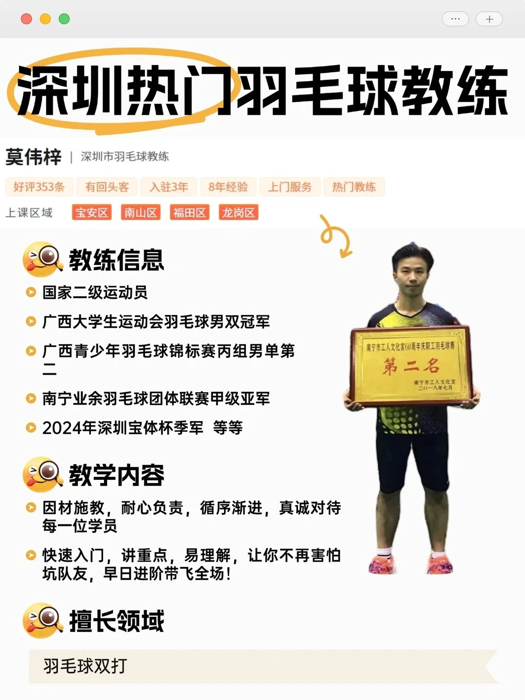 想了解更多教练信息或者课程细节的宝子,直接后台信息我就可以啦~深圳想练羽毛球的宝子,别错过这位口碑超棒的宝藏教练哦!🥰